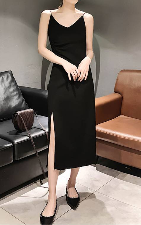 吊带裙可以凸显你的“腰线”和性感的上半身~如果你的吊带裙都是非常宽松的款式,那ta至少要够垂坠。如果吊带裙是宽松的A字形,觉得“显胖、显拖沓”,足够的垂坠加上有开叉的小心机!